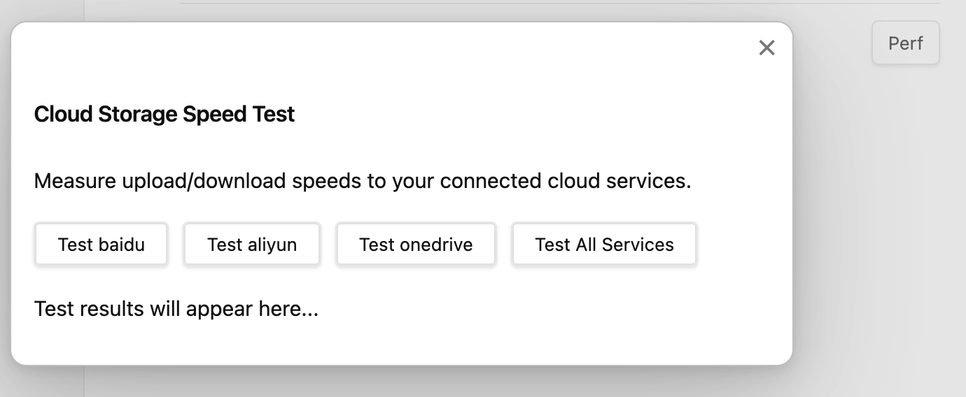 进入【高级功能】-【Debug】,找到“Cloud Drive Performance”项,点击右侧的Perf按钮,弹出如下界面: