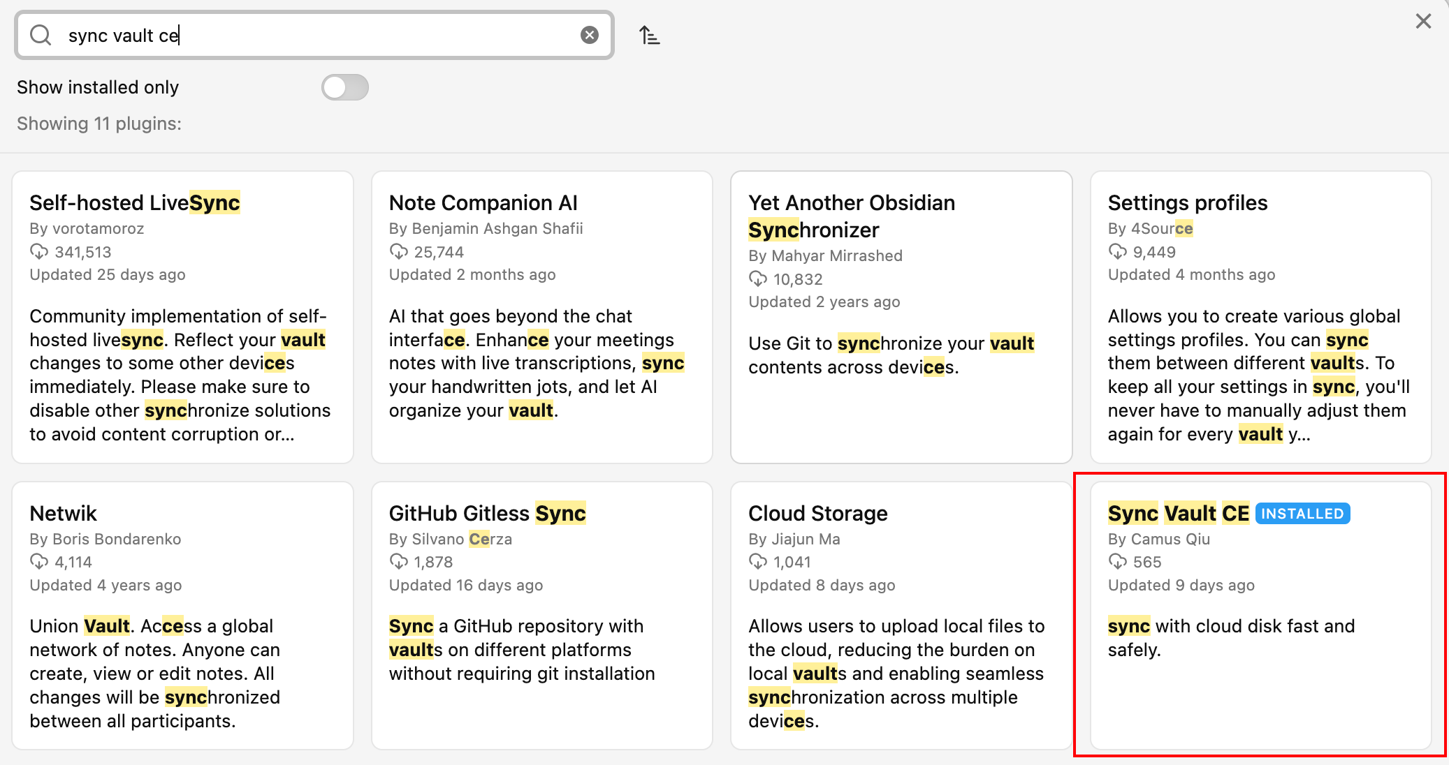 Step 1: install Sync Vault CE from Obsidian Plugin Market.