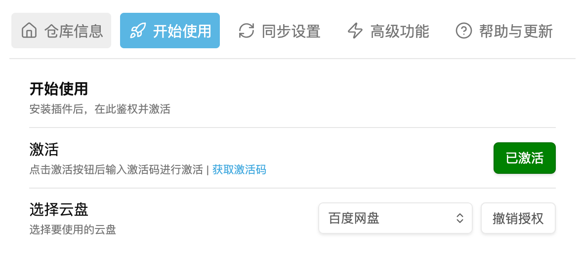 进入到插件设置界面,点击开始使用标签 ⇒ 点击开始授权按扭,按照屏幕指示完成网盘授权。 安装、激活、网盘授权步骤,点击查看,成功后的界面如下图所示: